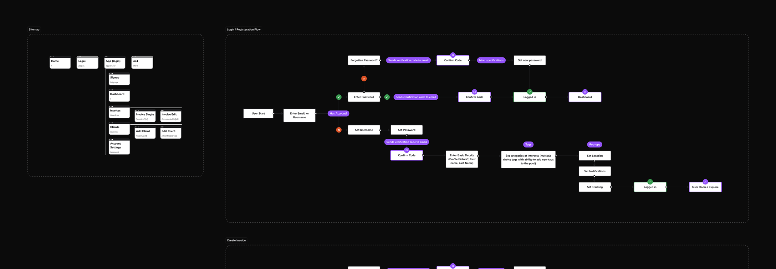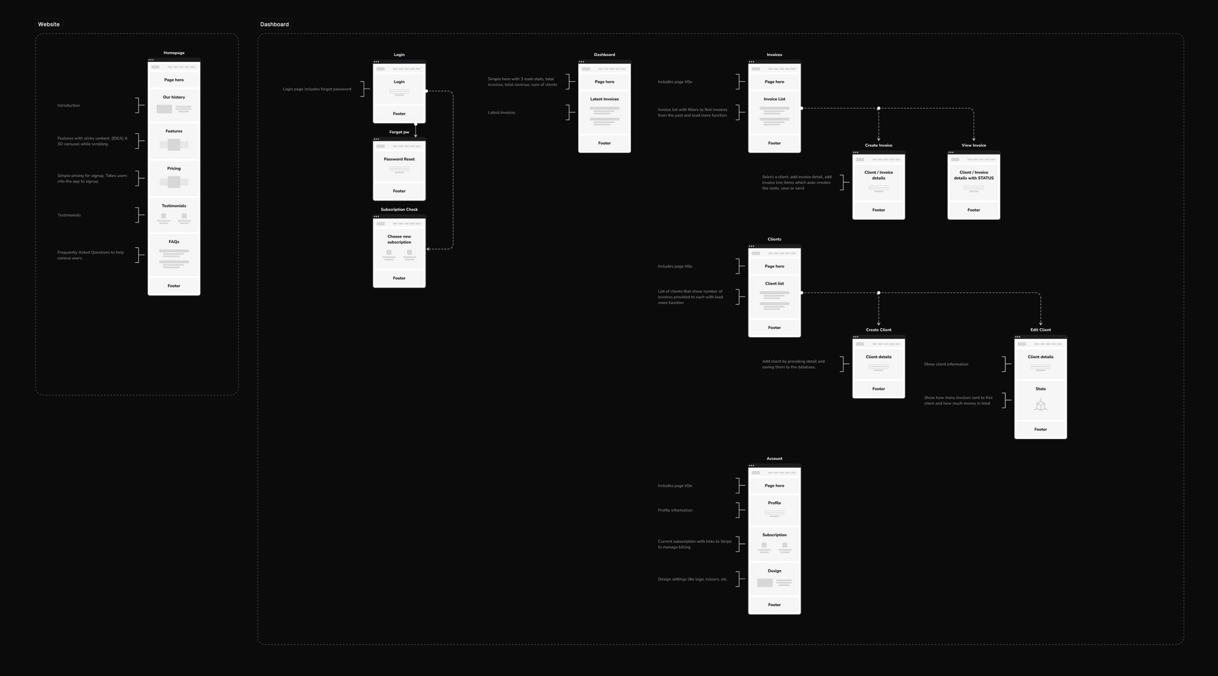 The largest part of the UX strategy is defining the structure of the website and app. I began with a small sitemap, a single homepage for the marketing website, then the app with the internal pages accessible only by logging in.